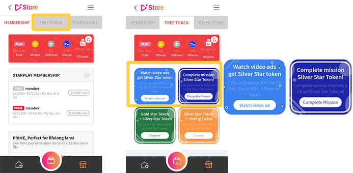 Para recolectar créditos dirígete al icono de la tienda, luego a free token. Puedes ver ads y cumplir misones.
